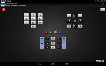 дистанционное ТВ универсальный – это приложение, которое позволит превратить ваше андроид устройство в настоящий пульт управления от телевизора. С его помощью вы сможете управлять своим телевизором марки Samsung без родного пульта. Так что если вы опять не можете найти злосчастную пластмассовую коробку с кнопками, то просто воспользуйтесь телефоном, на который установлена данная утилита. Приложение наделено простым интерфейсом и удобной навигацией, которая состоит из 3 вкладок. С его помощью можно даже играть в игры, которые присутствуют в телевизоре, и подключать в отдельных случаях гироскоп для более удобного управления той или иной доступной аркадой.