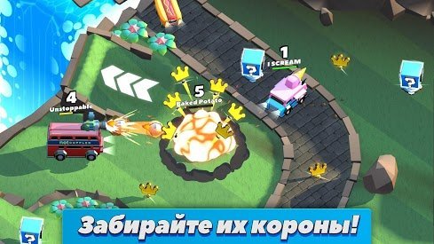 Crash of Cars является очень веселой аркадной гонкой, в которой вам придется соревноваться в мастерстве с другими игроками. Суть игры состоит в том, что вам нужно собрать как можно больше корон на поле и при этом подбирать различное вооружение, чтобы уничтожать врагов и забирать их короны. Игра эта очень забавная имеет интересную графику, множество разнообразных автомобилей, вооружения и так далее. Собирайте короны, убивайте своих оппонентов и занимайте первое место в игре. Игровой процесс длится до тех пор, пока кто-то из игроков не уничтожит вас, и сразу после этого вы сможете запустить новую игру с другими игроками. Если вам наскучило кататься на одной и той же машине, при этом у вас их открыто уже несколько выбирайте опцию рандом, и в каждый заезд вы будете попадать на случайном автомобиле.