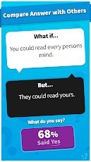 What if.. – это интересная программная разработка, которая создана для интересного провождения досуга. Это приложение является своеобразной игрой, где нужно будет отвечать на вопросы однозначно «да» или «нет». У них может быть общий, либо личный характер. Это придаст им особенную изюминку. Так, давая ответы на вопросы, пользователь сможет рассказать о себе много нового и интересного. Реализовано более 100 тысяч вопросов. База непрестанно пополняется, поэтому шанс встретится с повторным вопросом будет минимален. Интерфейс реализован простым и понятным, чтобы с ним было комфортно взаимодействовать.