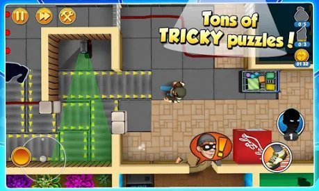 К достоинствам можно сразу отнести большой набор сложных уровней, все они весьма добротные и выгодно отличаться между собой. Притом по мере прохождения, будет расти не только сложность, но и разнообразие ловушек. Графика в игре весьма добротная, она красивая и хорошо проработанная, да все выполнено в стиле мультфильма, но для похожей игры, подобное подойдет идеально. Скачать Robbery Bob 2 Double Trouble на андроид, можно уже ради таких особенностей. Еще стоит упомянуть, что игра отлично оптимизированная. И пойдет на большей части устройств.