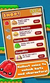 Зайдя в специальный магазин, пользователи, скачавшие Happy Jump, получат отличную возможность выбора иного персонажа, то есть можно выбрать другую каплю десерта, к тому же возможно прикупить для него модную шляпу, однако для реализации этого им потребуется насобирать определенное количество монет. Сделайте вашего сладкого персонажа счастливым.