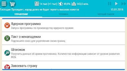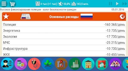 Russia simulator 2 is a strategy game with an exciting gameplay. Here the user can be in the place of the President of the Russian Federation. Having settled in a prestigious position, the player will be able to manage Affairs in various areas of public life. Various issues related to corruption, security, and cataclysms will be under control. There will be external and internal opponents. In addition, the user will need to take care of the country's authority in the world. You need to defend your reputation among other politicians. With this game you will have an interesting time.